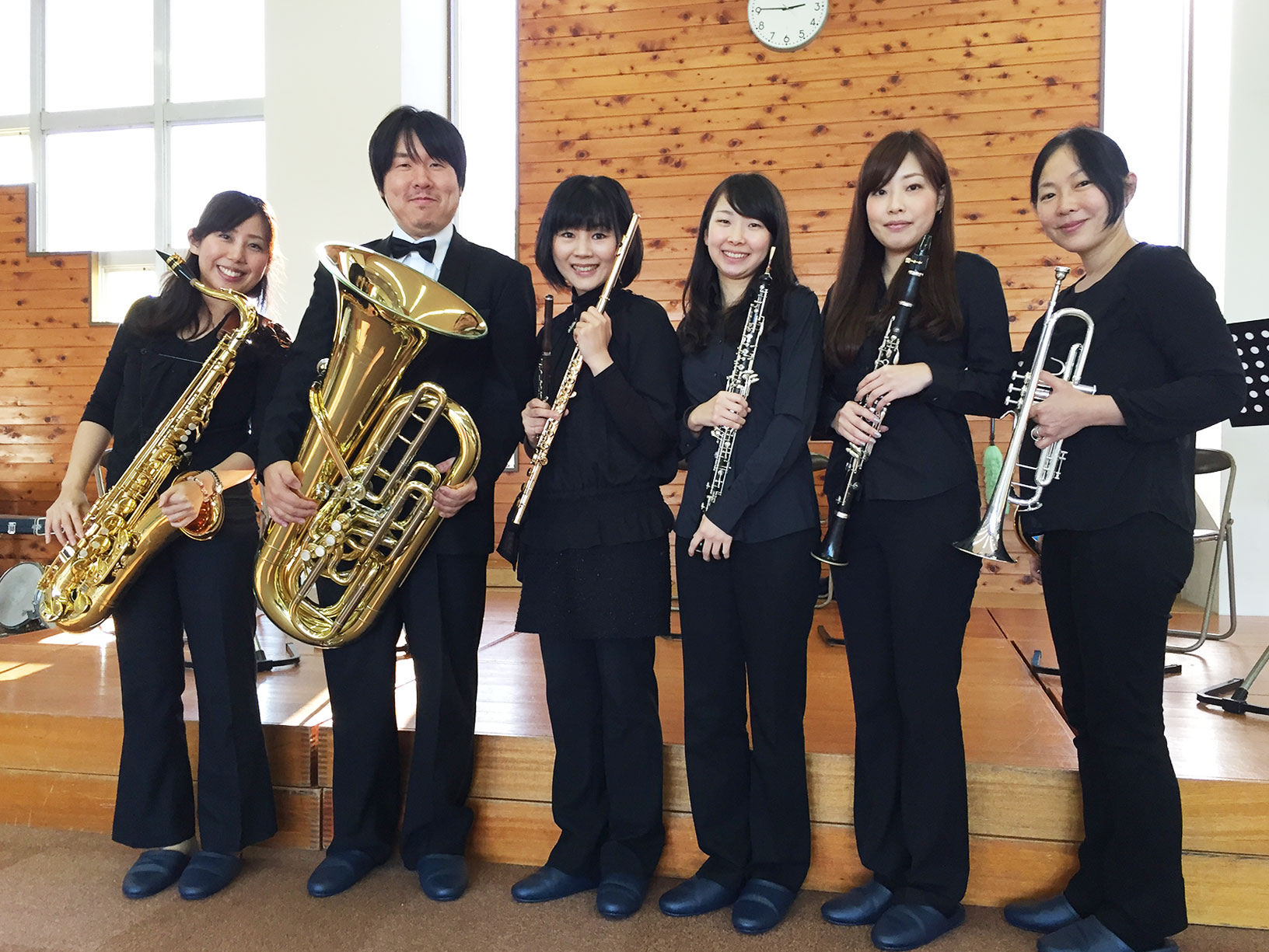 木管楽器(オーボエ、ファゴット、フルート、クラリネット、サックス)+ 打楽器やピアノによる多重奏。基本5〜6人の編成です。木管楽器ならではの優しい音で、音量も小さめなので、サロンや小さめのホール(300人くらいまで)に向いています。各楽器の特徴、音色が際立っているので、各パートがソリストであるかのような音を楽しんていただけます。